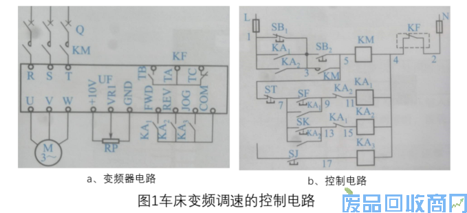 正转和反转只有在变频器接通电源后才能进行,变频器只有在正反转都不工作时才能切断电源。由于车床要有点动环节,故在电路中增加了点动控制按钮SJ和继电器KA3