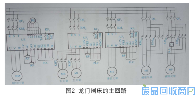 ① 创台往复电动机(MM)。由变频器UF1控制,变频器的通电和断电由空气断路器QF1和接触器KM1控制;刨台前进和后退的转速大小分别由电位器RP1和RP2控制,正、反转及点动(刨台步进和步退)则由PLC控制。