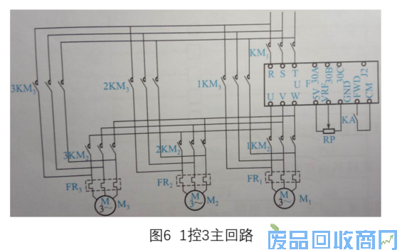 (1)主回路以1控3为例,其主电路如图6所示,其中接触器1KM2、2KM2、3KM2分别用于将各台水泵电动机接至变频器,接触器1KM3、2KM3、3KM3分别用于将各台水泵电动机直接接至工频电源。