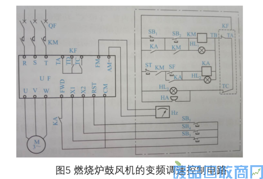 燃烧炉鼓风机的变频调速控制电路如图5所示。图中,按钮开关SB1和SB2用于控制接触器KM,从而控制变频器的通电与断电。