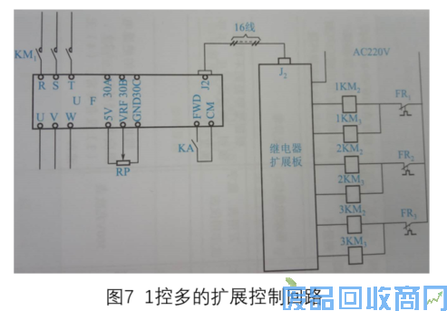 例如国产森兰B12S系列变频器在进行多台切换控制时,需要附加块继电器扩展板,以便控制线圈电压为交流220V的接触器。具体接线方法如图7所示。