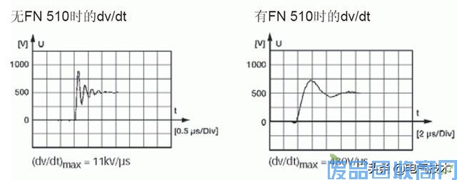 很明显,安装F510系列滤波器后,大大降低了IGBT电动机驱动端的输出电压dv/dt,变频器的输出波形也大为改善,且测试后满足DIN VDE0530标准。