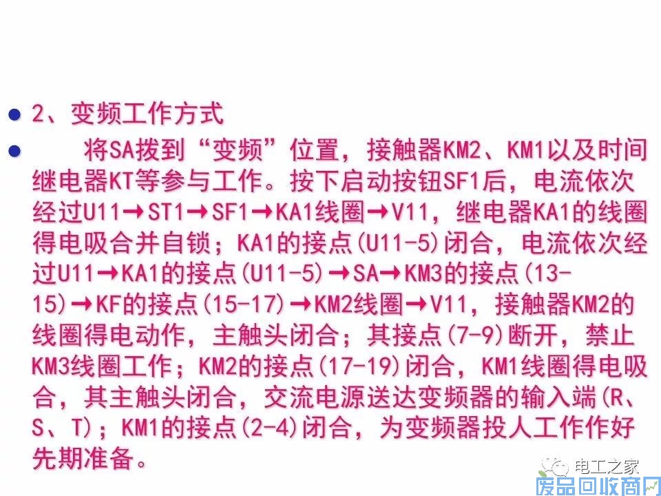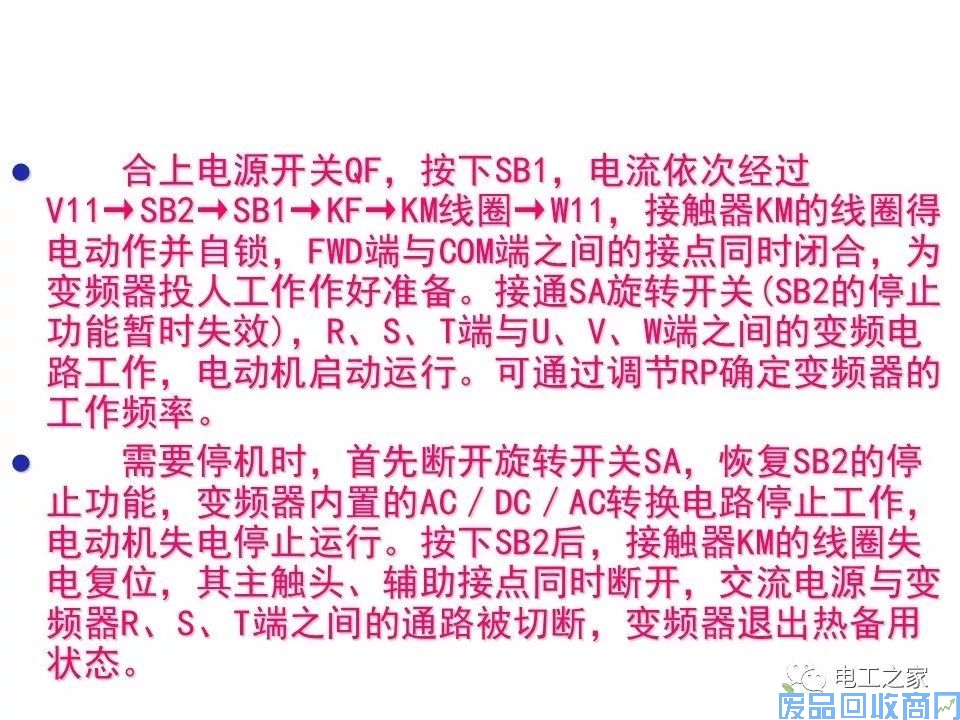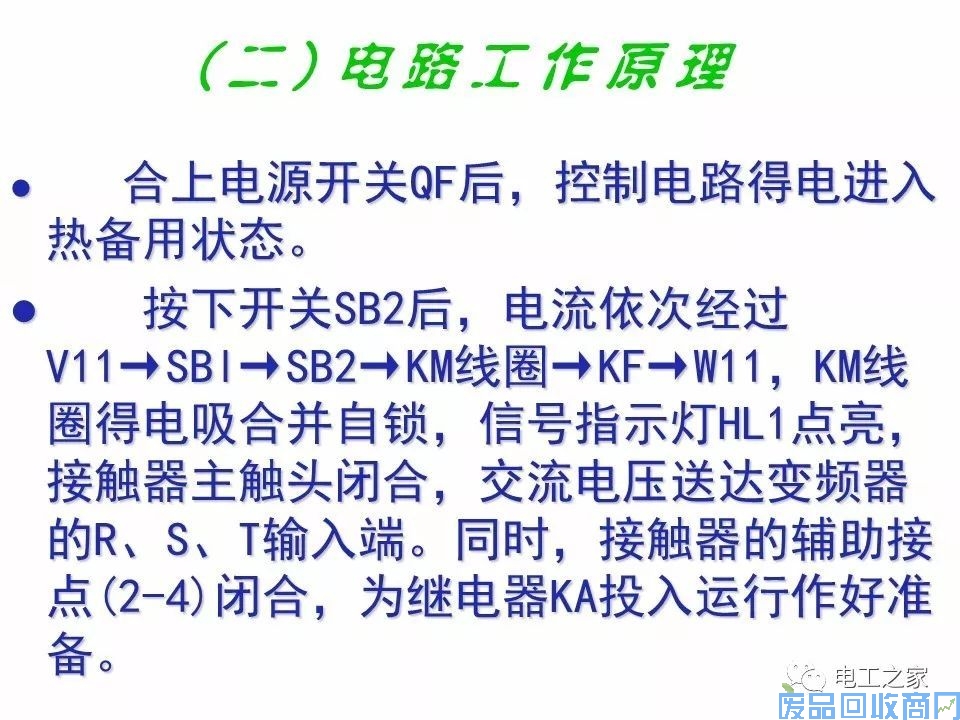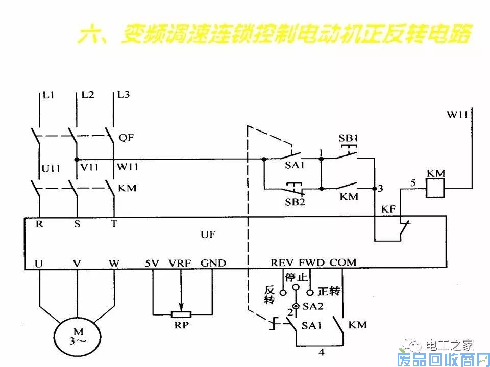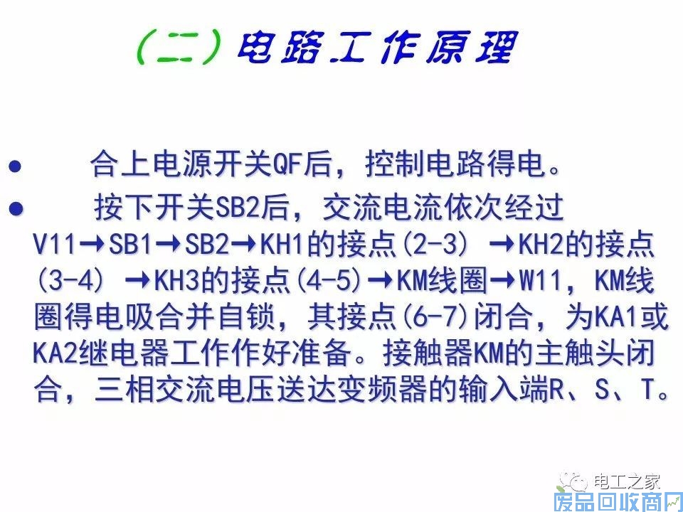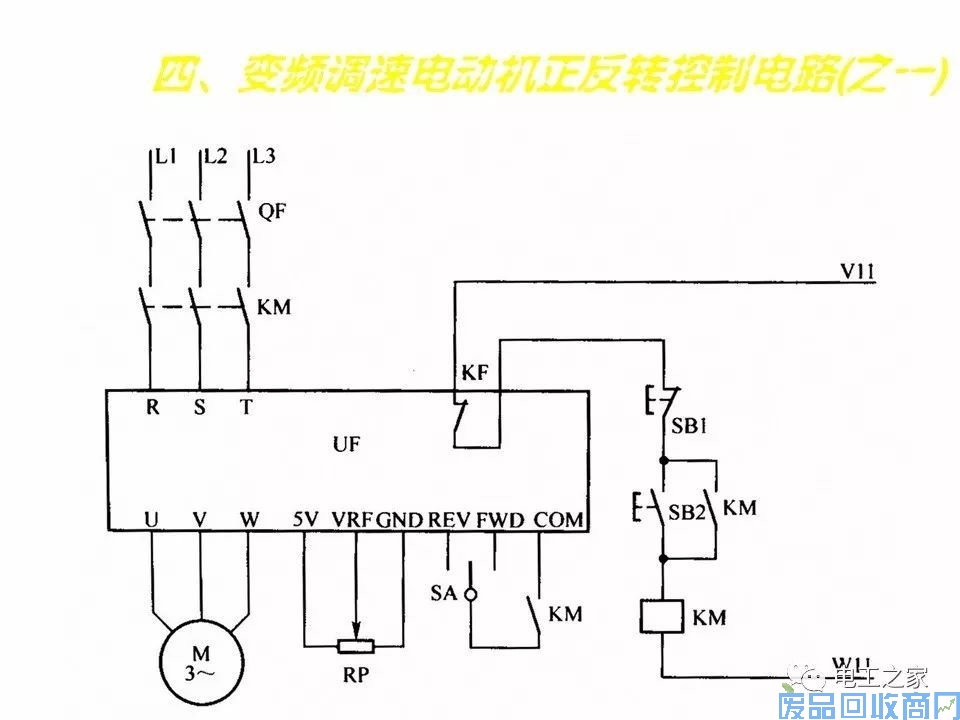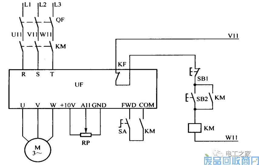 合上电源开关QF,电路输入端得电进人备用状态。按下控制按钮SB2后;电流依次经过V11→KF→SBl→SB2→KM线圈→W11,接触器的线圈得电吸合,它的一组动合接点闭合自锁,另一组动合接点也闭合,为SA按钮操作作好准备。同时,接触器主触头闭合,变频器进入热备用状态。