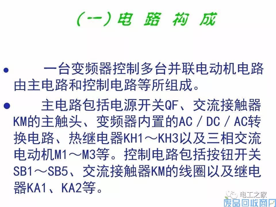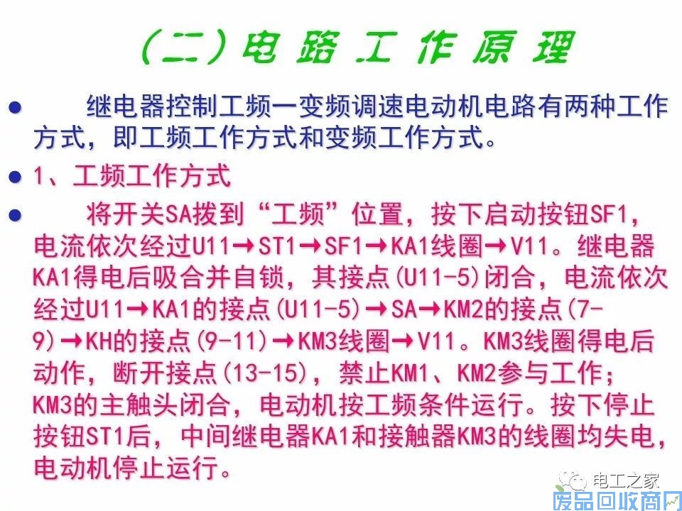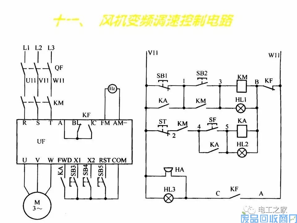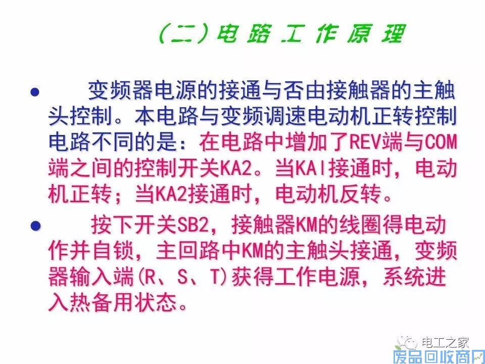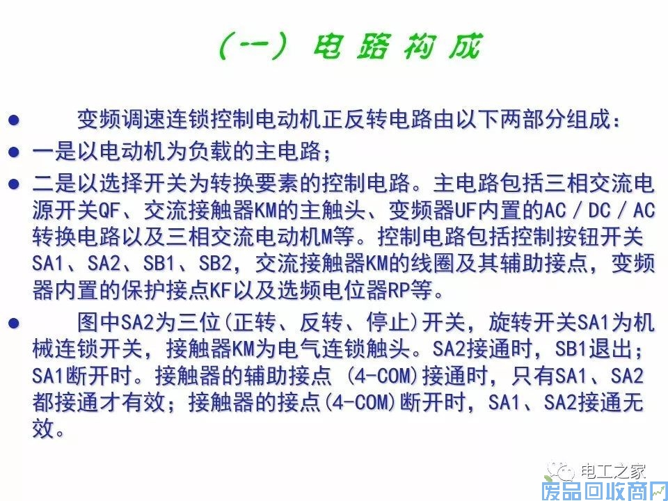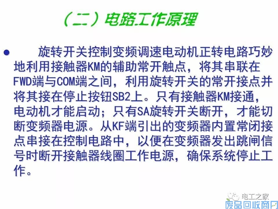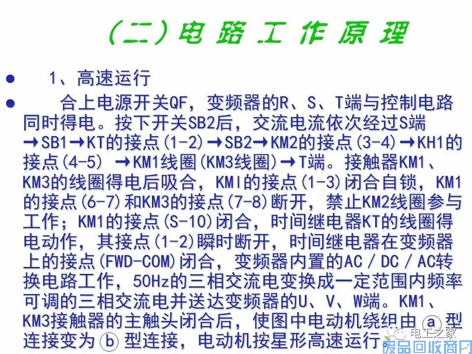 合上电源开关QF,电路输入端得电进人备用状态。按下控制按钮SB2后;电流依次经过V11→KF→SBl→SB2→KM线圈→W11,接触器的线圈得电吸合,它的一组动合接点闭合自锁,另一组动合接点也闭合,为SA按钮操作作好准备。同时,接触器主触头闭合,变频器进入热备用状态。
