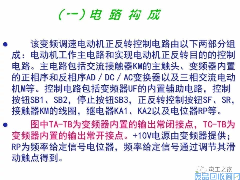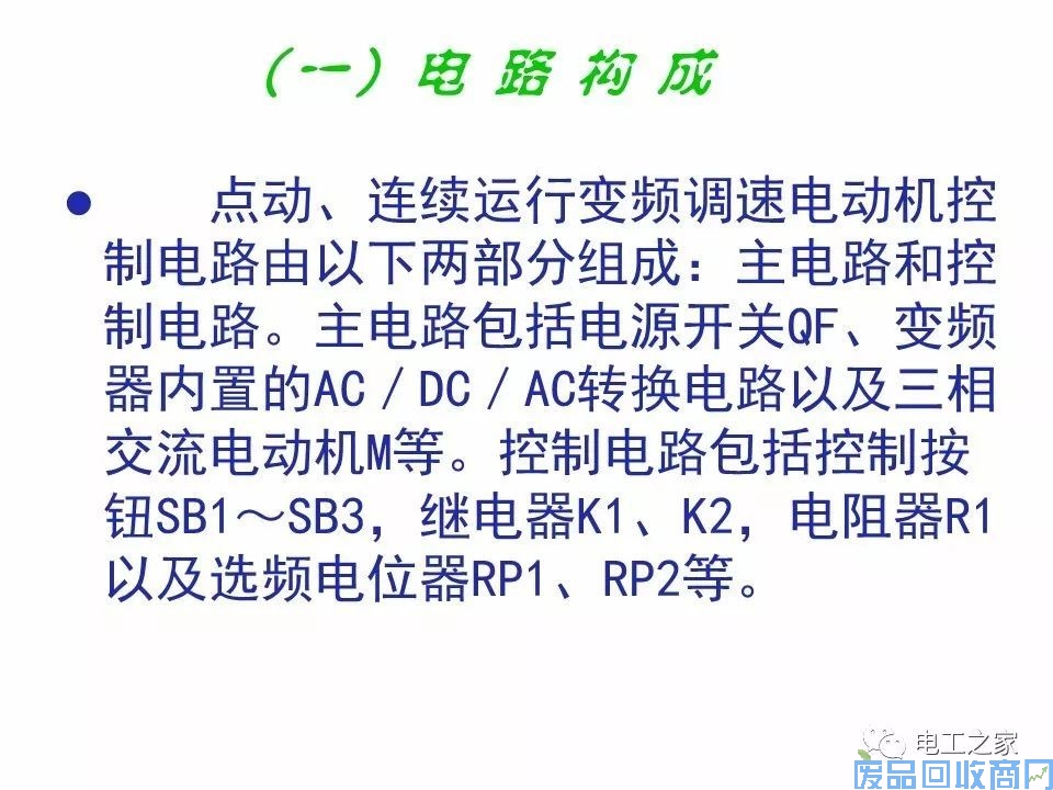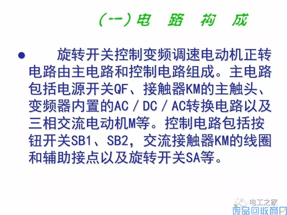 该变频调速电动机正转控制电路由主电路和控制电路等组成。主电路包括自动空气开关QF、交流接触器KM的主触头、变频器内置的AC/DC/AC转换电路以及三相交流电动机M等。控制电路包括控制按钮SA、SB1、SB2,交流接触器KM的线圈和辅助接点以及频率给定电路等。