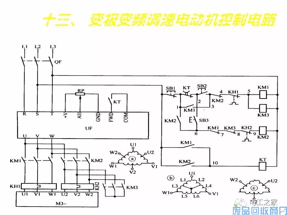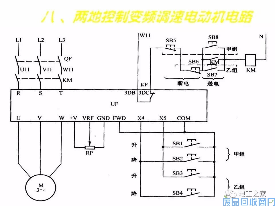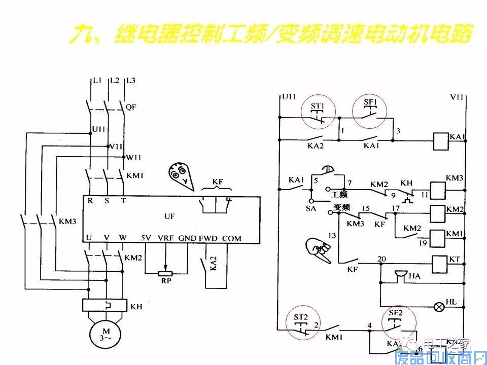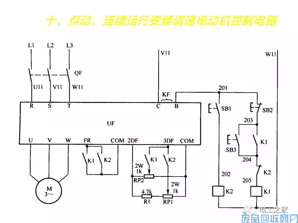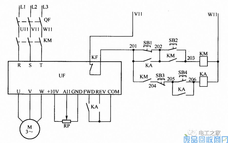 在控制电路中,变频器的过热保护接点用KF表示。+10V电压由变频器UF提供;RP为频率给定信号电位器,频率给定信号通过调节其滑动触点得到。