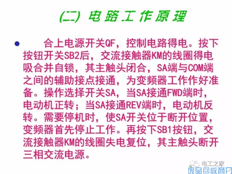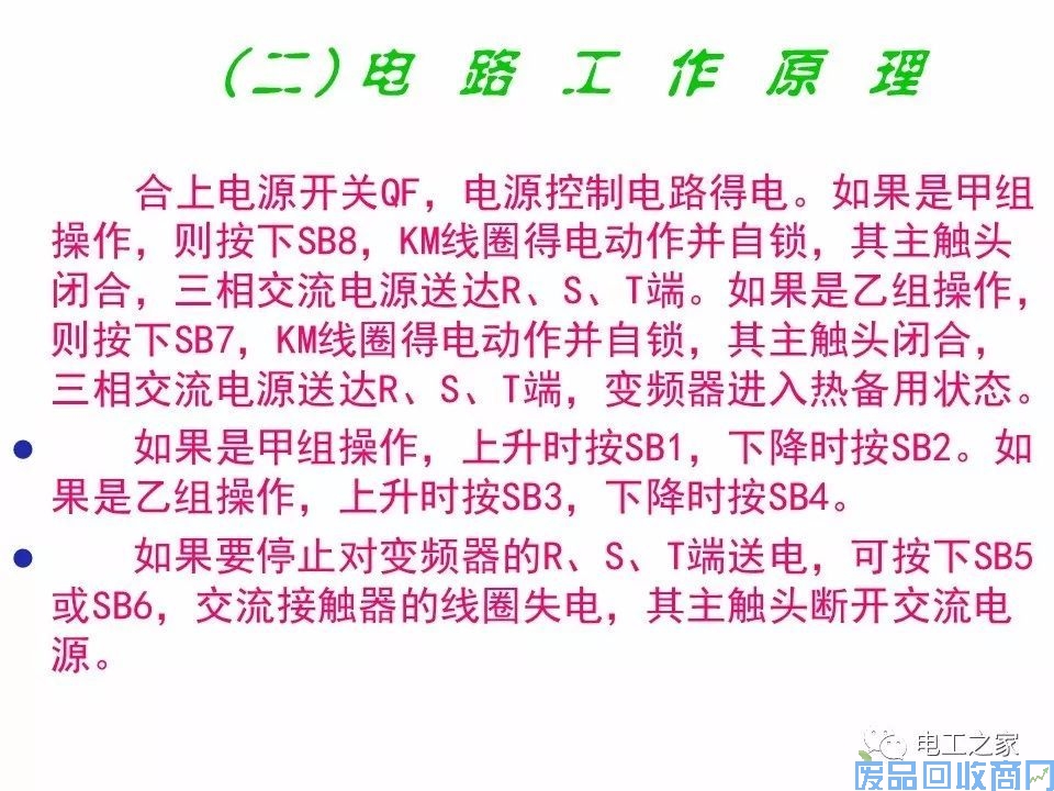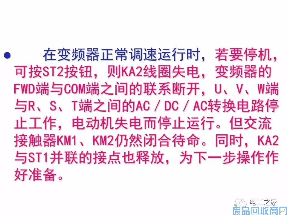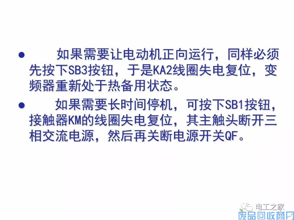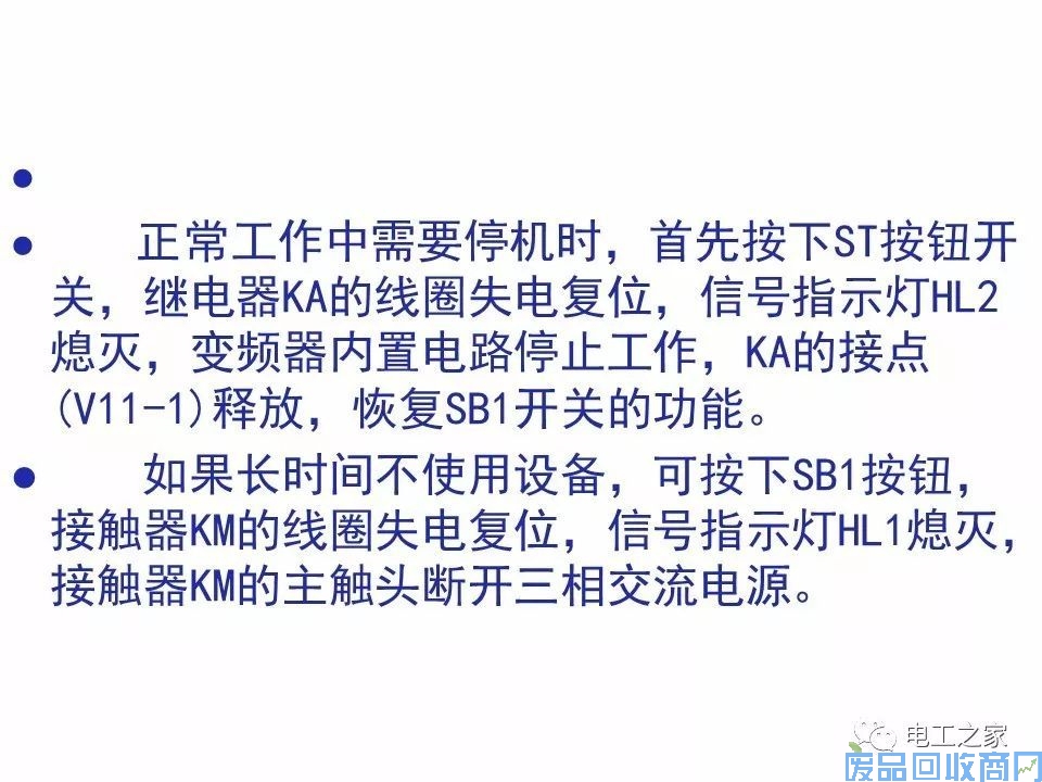停机时,按下SB3开关,中间继电器KA的线圈失电复位,KA的接点(FWD-COM)断开,变频器内置的AC/DC/AC电路停止工作,电动机M失电停机。同时,KA的接点(201--202)解锁,为KM线圈停止工作作好准备。如果设备暂停使用,就按下开关SB1,KM线圈失电复位,其主触头断开,变频器的R、S、T端脱离电源。如果设备长时间不用,应断开电源开关QF。
