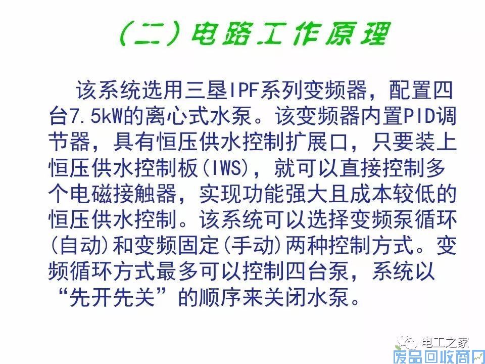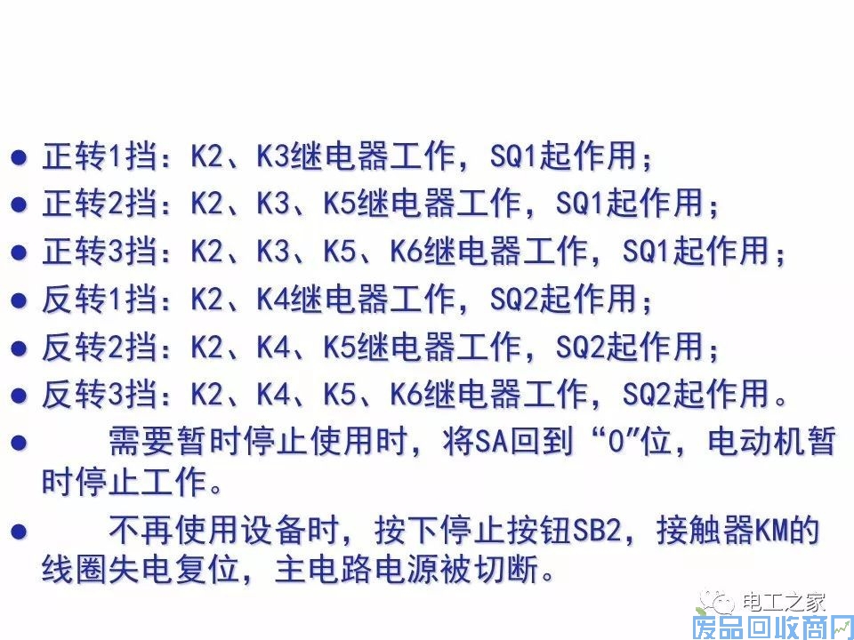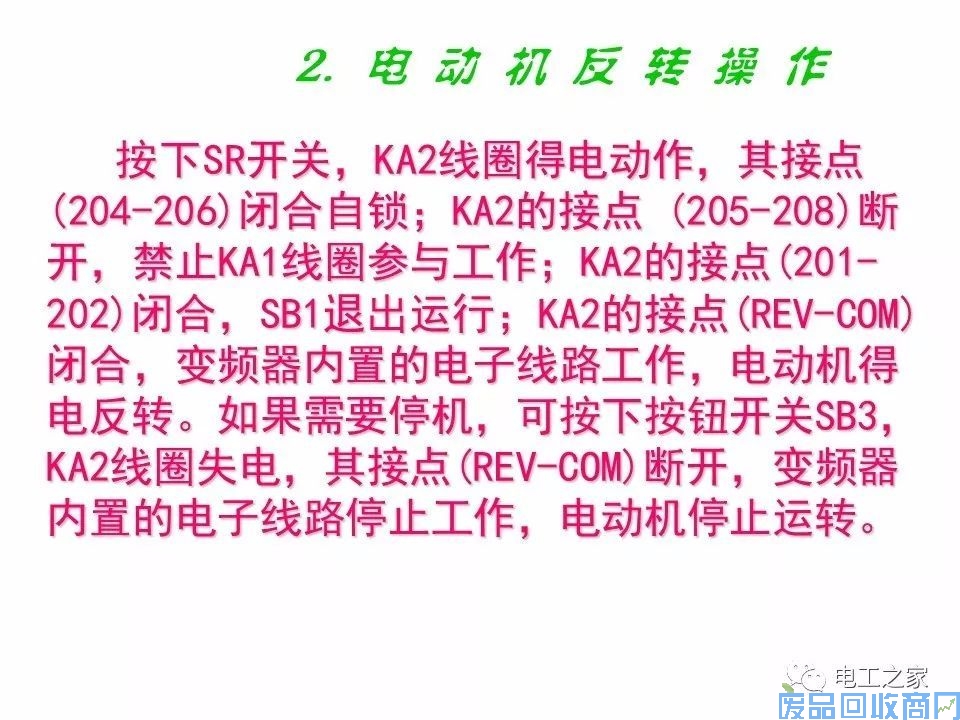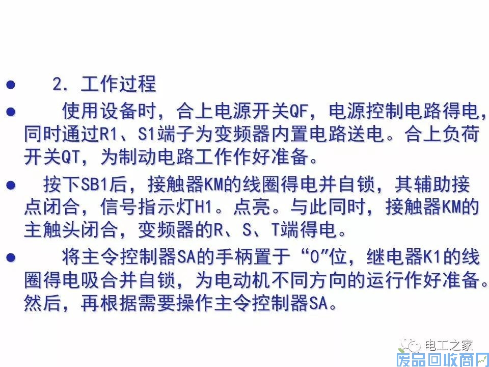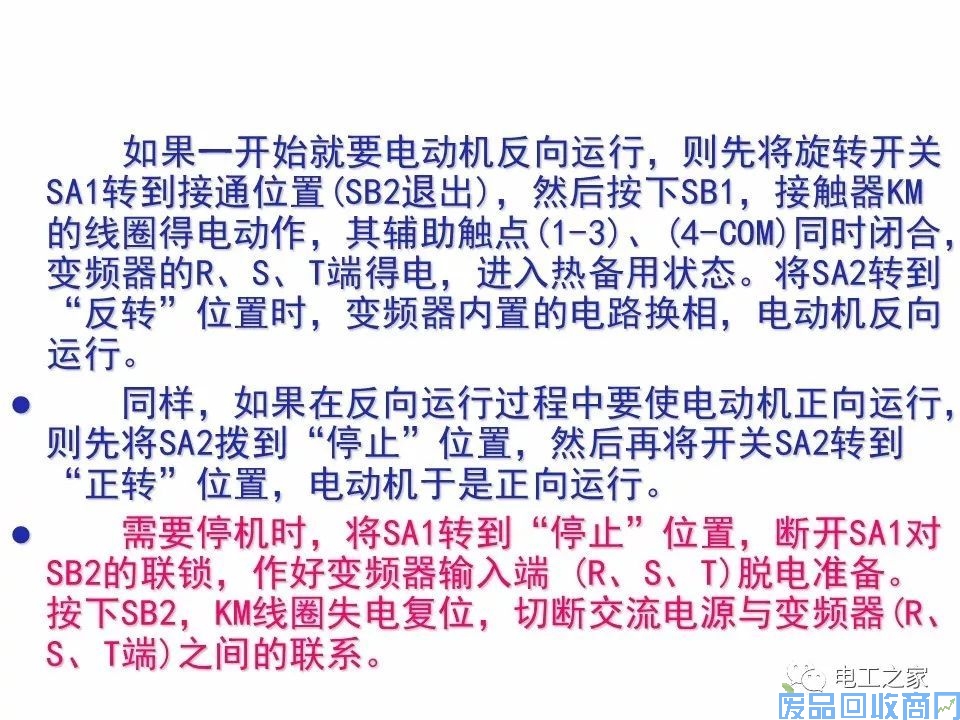 停机时,按下SB3开关,中间继电器KA的线圈失电复位,KA的接点(FWD-COM)断开,变频器内置的AC/DC/AC电路停止工作,电动机M失电停机。同时,KA的接点(201--202)解锁,为KM线圈停止工作作好准备。如果设备暂停使用,就按下开关SB1,KM线圈失电复位,其主触头断开,变频器的R、S、T端脱离电源。如果设备长时间不用,应断开电源开关QF。