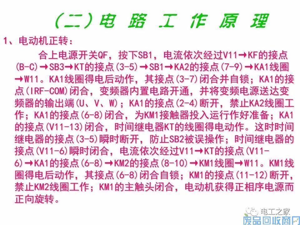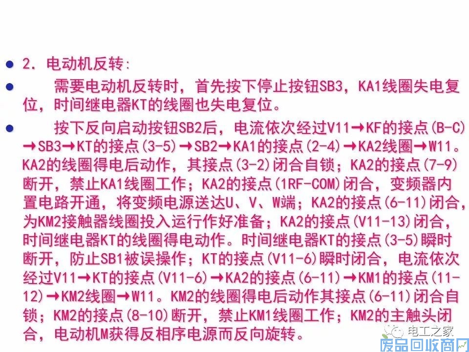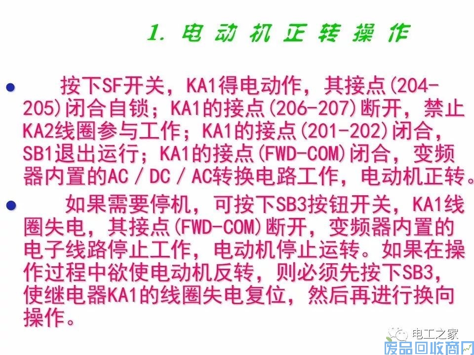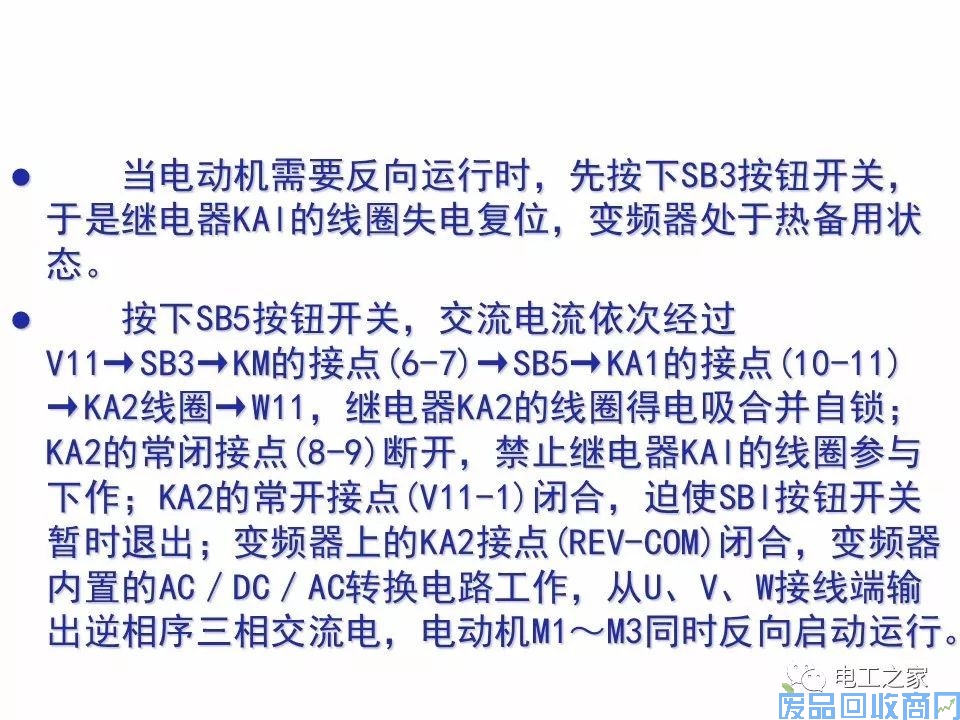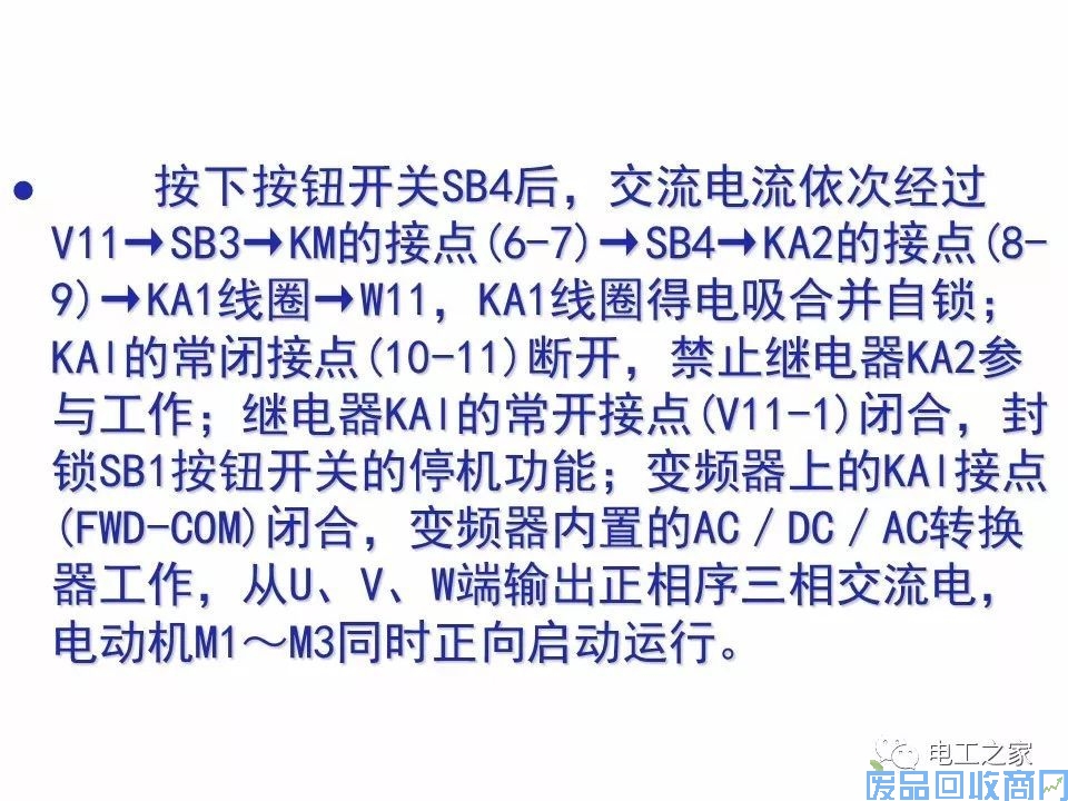 按下开关SB4后,电流依次经过V11→KF→KM的接点(201—204)→SB3→SIM→KA线圈→W11,KA线圈得电动作,其接点(205—206)闭合自锁;KA的接点(201—202)闭合,防止操作SB1时断电;KA的接点(FWD--COM)闭合,变频器内置的AC/DC/AC电路工作,电动机M得电运行。