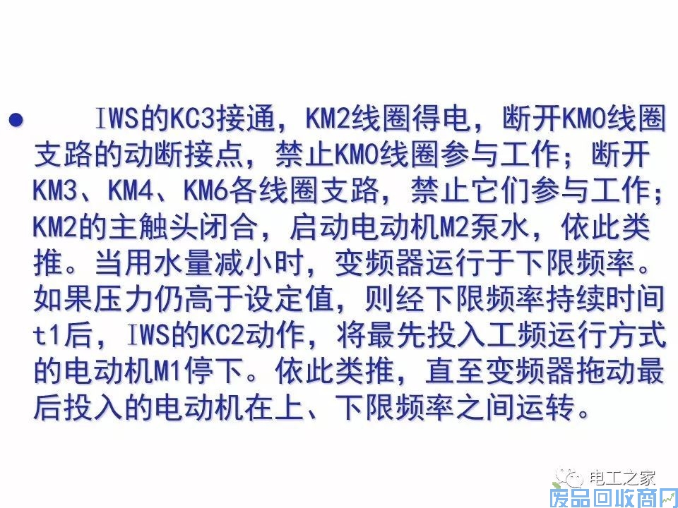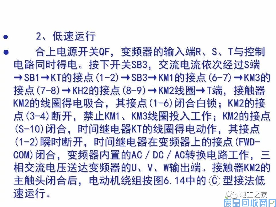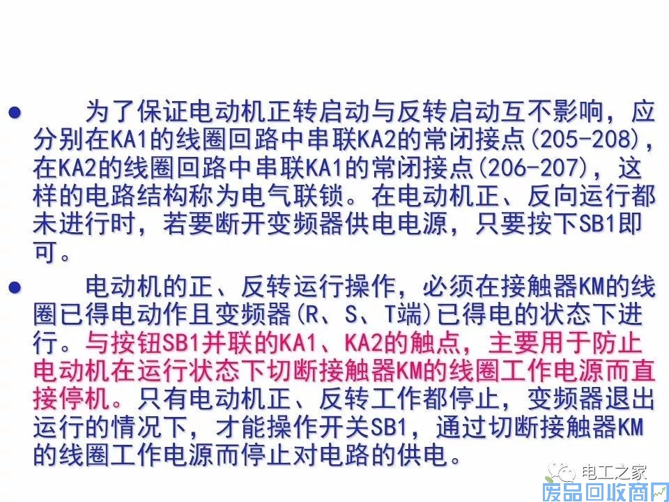 控制电路中的接触器与中间继电器之间有连锁关系:一方面,只有在接触器KM动作使变频器接通电源后,中间继电器KA才能动作;另一方面,只有在中间继电器KA断开,电动机减速并停机时,接触器KM才能断开变频器的电源。