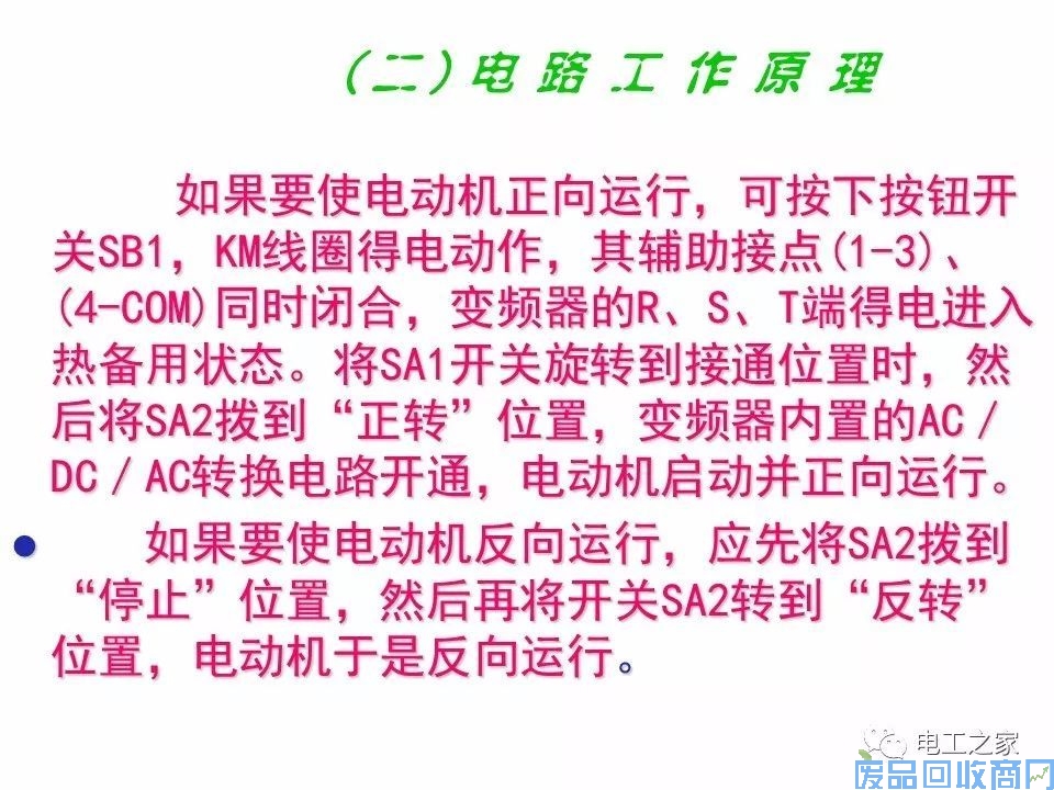 操作旋转开关SA,闭合FWD(正转控制端子)-COM(公共端)端子,变频器启动运行,电动机工作在变频调速状态。变频器可按厂方设定的参数值运行,也可按用户给定的参数条件运行。REV(反转控制端子)