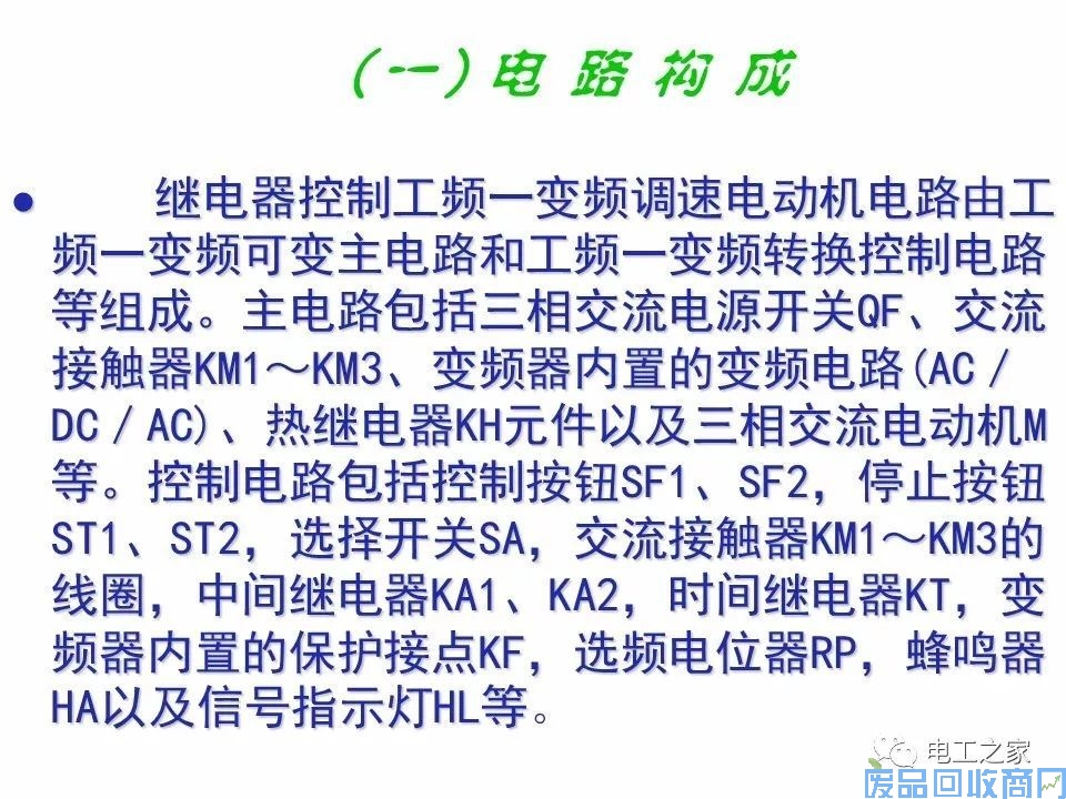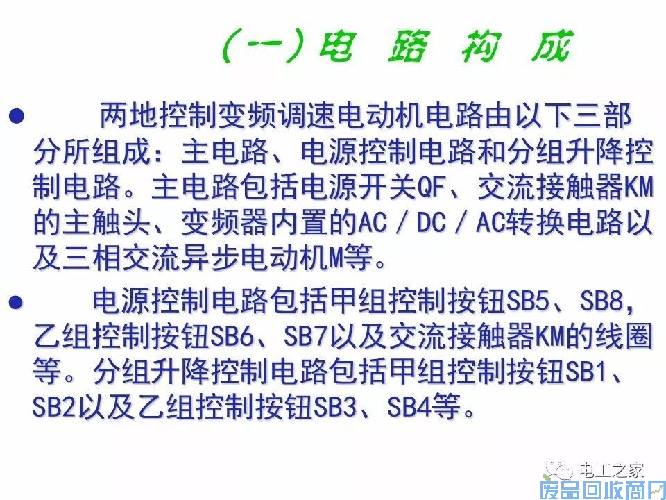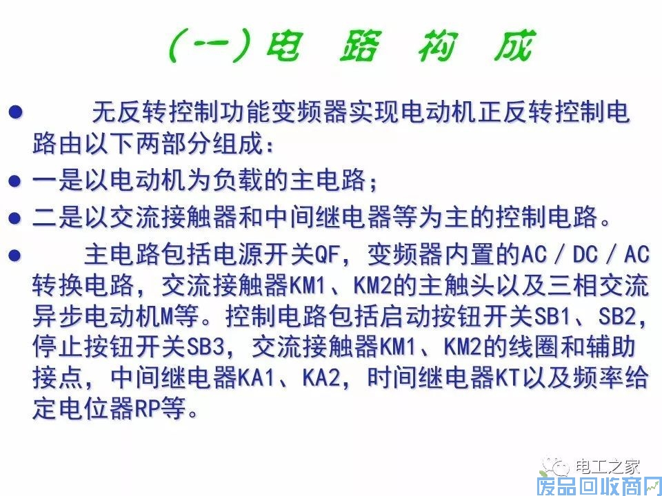 该变频调速电动机正转控制电路由主电路和控制电路等组成。主电路包括自动空气开关QF、交流接触器KM的主触头、变频器内置的AC/DC/AC转换电路以及三相交流电动机M等组成。控制电路包括控制按钮SBl~SB4、中间继电器KA、交流接触器的线圈和辅助接点以及频率给定电路等。