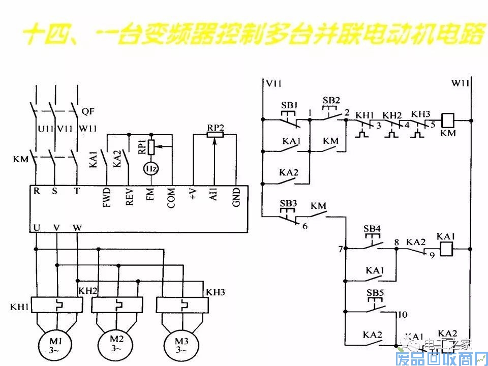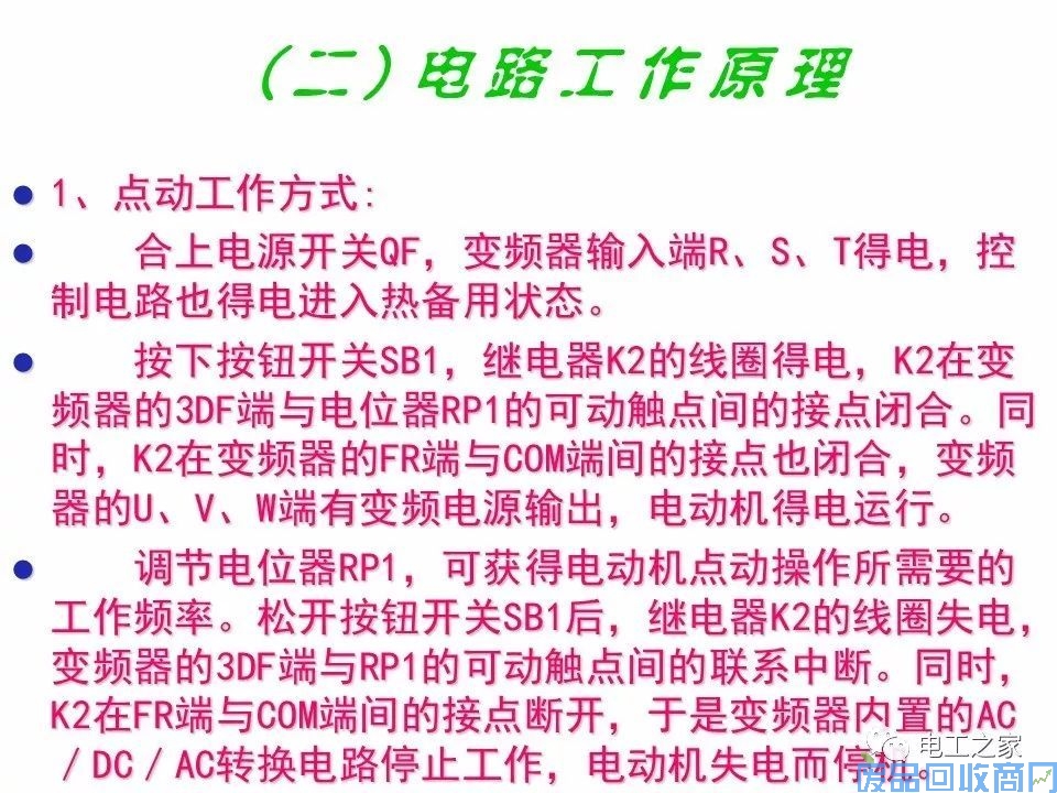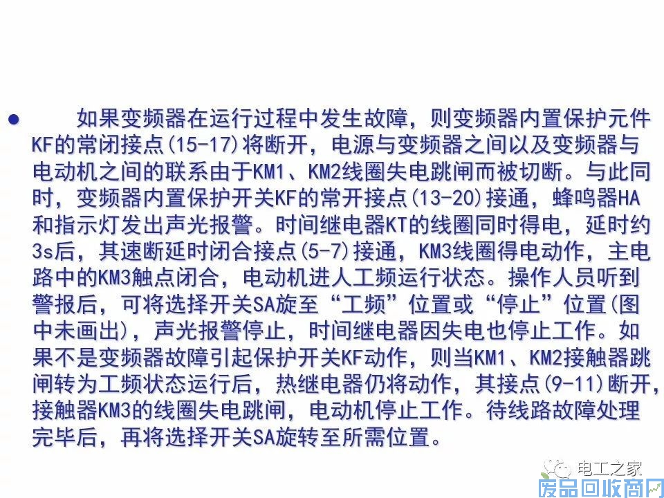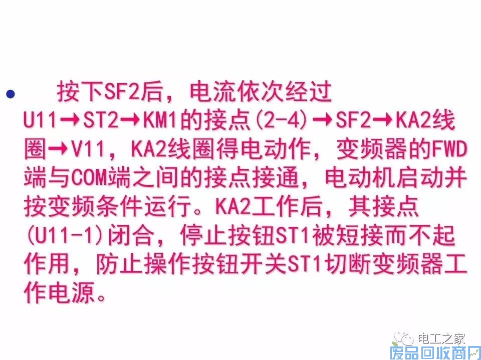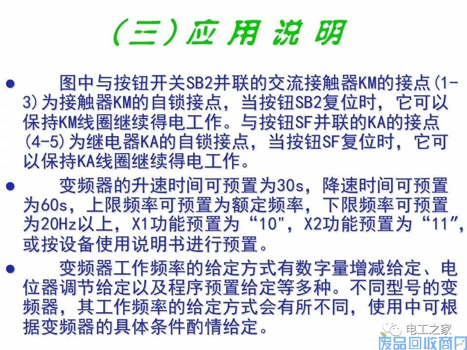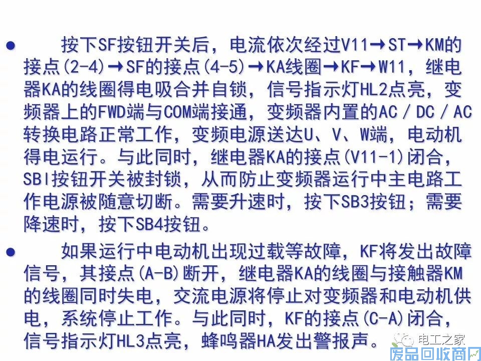 图中SB1、SB2用于控制接触器KM的线圈,从而控制变频器的电源通断。按钮开关SB1、SB3用于控制继电器KA,从而控制电动机的启动和停止。当电动机工作过程中出现异常而使接点KF断开时,KM、KA线圈失电,电动机停止运行。