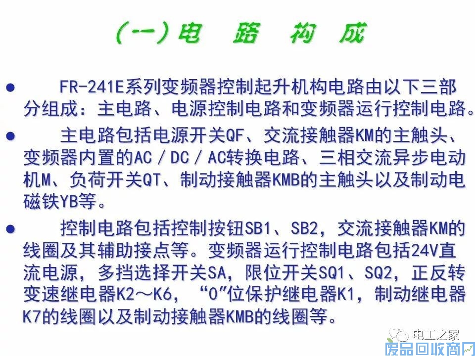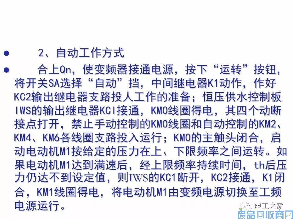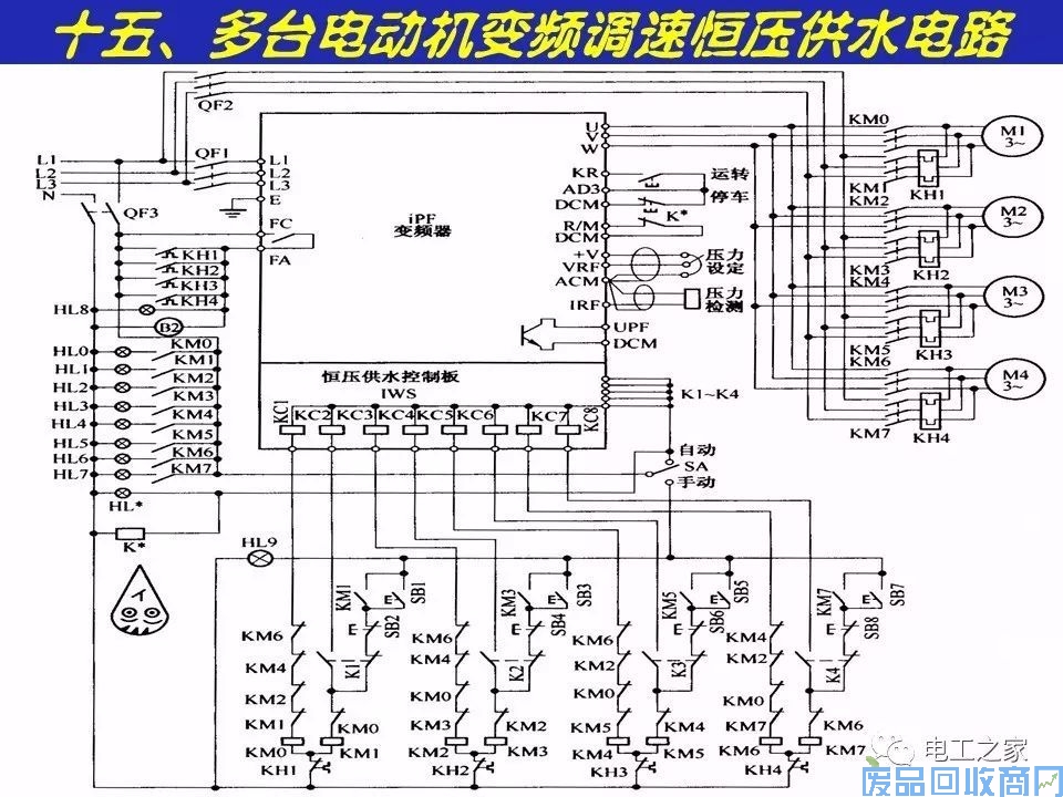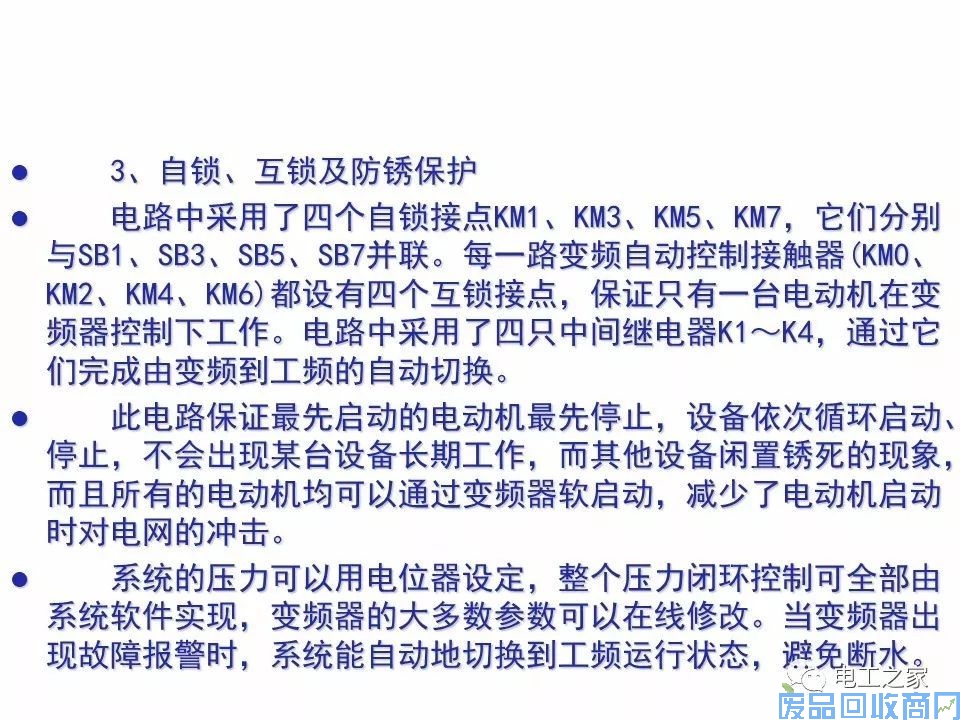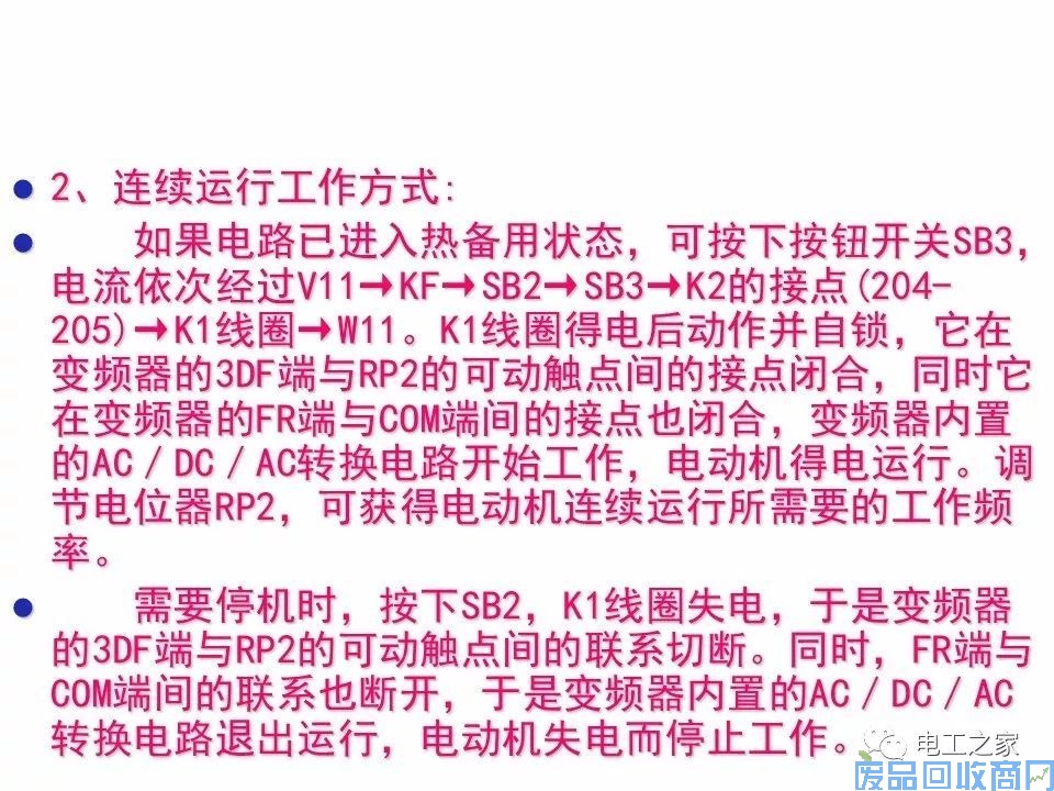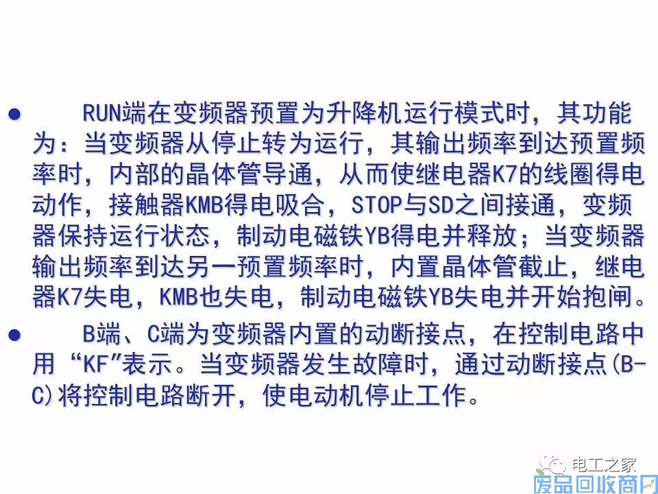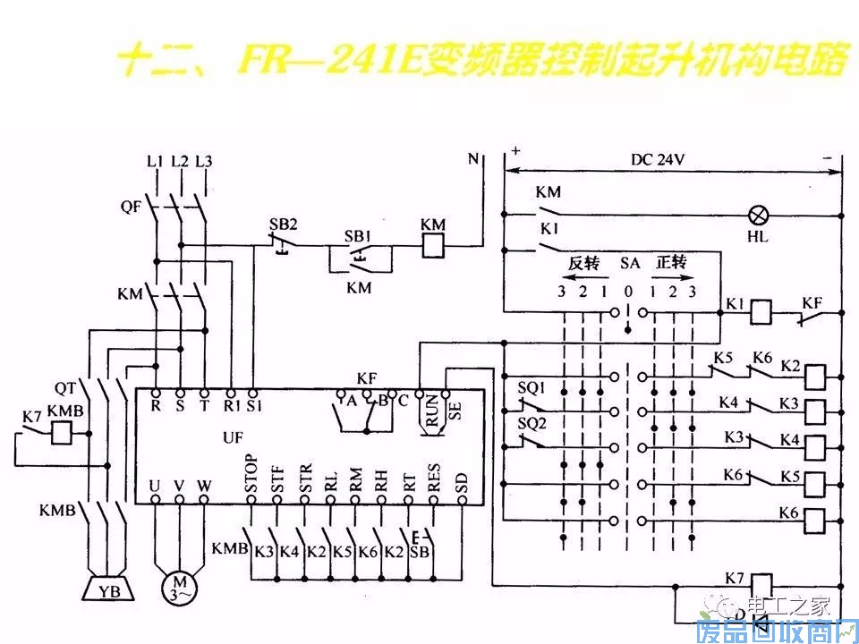 图中SB1、SB2用于控制接触器KM的线圈,从而控制变频器的电源通断。按钮开关SB1、SB3用于控制继电器KA,从而控制电动机的启动和停止。当电动机工作过程中出现异常而使接点KF断开时,KM、KA线圈失电,电动机停止运行。