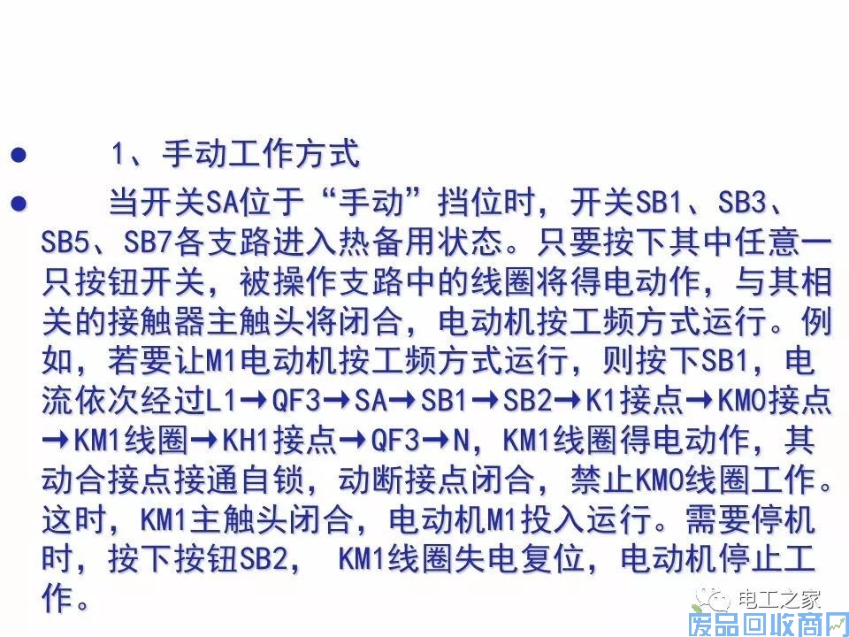 合上电源开关QF,控制电路得电。按下启动按钮SB2后,电流依次经过V11→KF→SBl→SB2→KM线圈→W11,KM线圈得电动作并自锁;KM的接点(201—204)闭合,为中间继电器运行作好准备;KM主触头闭合,主电路进入热备用状态。