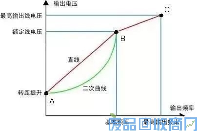 如下图,V/F符合直线AB,则是直线型;符合折线段ABC,则是多点型;符合曲线AB,则是平方型。
