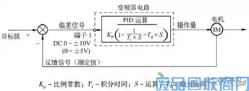 通过变频器实现PID控制有两种情况:一种是变频器内置PID控制功能,给定信号通过变频器的键盘面板或端子输入,反馈信号反馈给变频器的控制端,在变频器内部进行PID调节以改变输出频率;另一种是用外部的PID调节器将给定量与反馈量比较后输出给变频器加到控制端子作为控制信号。总之,变频器的PID控制是与传感器元件构成的一个闭环控制系统,可以实现对被控制量的自动调节。