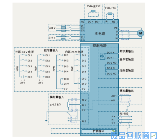 变频器主要由整流(交流变直流)、滤波、逆变(直流变交流)、制动单元、驱动单元、检测单元微处理单元等组成。变频器靠内部IGBT的开断来调整输出电源的电压和频率,根据电机的实际需要来提供其所需要的电源电压,进而达到节能、调速的目的,另外,变频器还有很多的保护功能,如过流、过压、过载保护等等。随着工业自动化程度的不断提高,变频器也得到了非常广泛的应用。