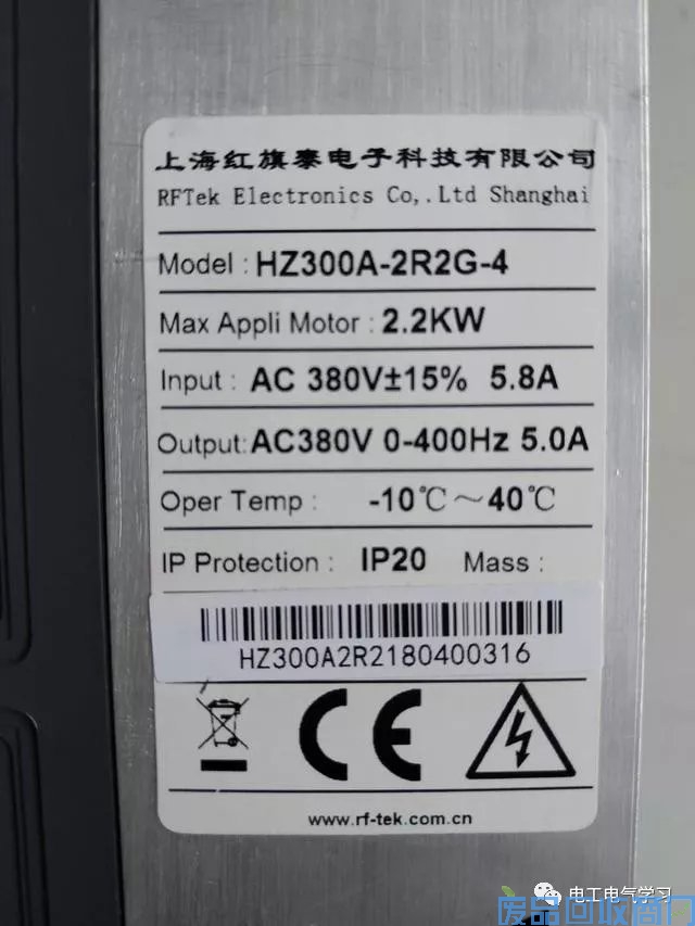 1、观察这个变频器的铭牌,并从铭牌中理解变频器的命名规则,从命名规则中可以知道,这个型号是 HZ300A-2R2G-4,功率是2.2KW,输入是AC 380V+15%、5.8A,输出是AC380V、0-400Hz、 5.0A。