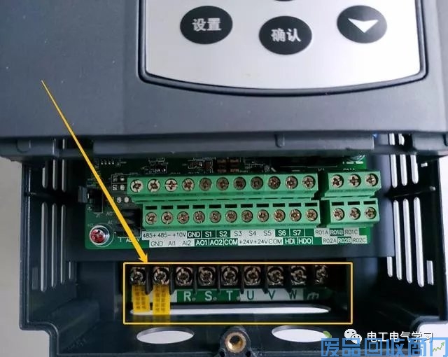 4、拆卸完前盖板后,进行主电路接线,其中R、S、T是电源进线,U、V、W是出线,接电动机,注惫为保证电气安全,必须进行可靠接地。