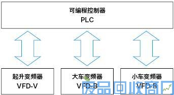电气控制系统采用PLC控制起升、大车、小车变频器的运行。PLC接受联动台主令信号输出运行信号和多段速指令给变频器运行。起升机构、大车、小车独立运行。