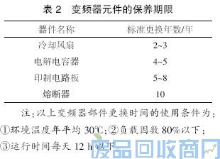 为了使变频器长期正常工作,必须针对变频器内部电子元器件的使用寿命,定期进行保养和维护。变频器电子元器件的使用寿命又因其使用环境和使用条件的不同而不同。表2所列变频器的保养期限仅供用户使用时参考。