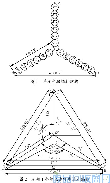 如图2(此图按照等比例1颐5.77所绘)所示,如果A 相有一个功率单元故障旁通掉,中性点由O偏移到O忆(虚拟中性点),经过运算,线电压由原来的1 039.23 V(1 039.23伊5.77=5 996 V)变为978.5 V(978.5伊5.77=5 646),相角度由120毅变为125.4毅和109.2毅。虽然相电压不相等,但是输出的线电压保持相等。这样就保证了电机的三相电流平衡。同理如果出现2 个或3 个单元旁通时,经过复杂运算,也可实现中性点偏移,从而保证输出的线电压相等。