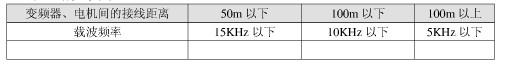 变频器与电机间的接线距离较长的场合,来自电缆的高次谐波漏电流,会对变频器和周边设备产生不利影响。因此为减少变频器的干扰,需要对变频器的载波频率进行调整,请参考下表: