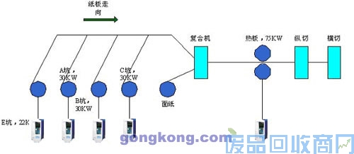 工艺描述: 五层纸生产线主要有坑机、复合机、热板、纵切机、横切机组成。坑机用来将原纸制造出波浪,根据波浪的疏密程度可分为A、B、C、E四种。波浪是由电动机带动浪辊在固定的有槽的钢板上将纸挤压形成的。坑机电动机的功率一般在22KW和30KW。复合机用于将生产出来的浪纸和芯纸再加两层面纸复合在一起,这样就生成了五层纸板。在通过热板干燥,纵切机切边和压痕,然后由横切机进行剪裁。本次改造主要是4台坑机和热板的变频改造,以获得优良的调速效果和节能效果。