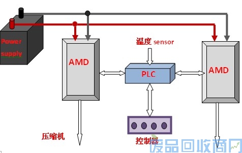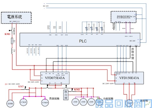 变频制冷系统控制如图2所示。系统采用台达E 系列 15KW变频器驱动压缩机,7.5KW变频器驱动蒸发机。变频器蓄电池共线母线检测供电电压值,,由内部PLC程序进行运算,决定此时压缩机和蒸发机应该工作在那种状态,来得出变频器的输出频率值。同时外部PLC通过温度传感器检测回来的模拟量,及控制器设定的温度值,来计算出变频器应该工作的频率,使变频器加速或减速,以调节车内的温度变化,达到车内温度自动调节的目的。