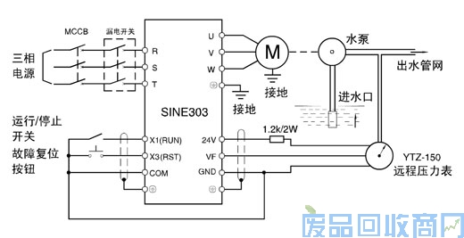 关掉电源,电源指示灯熄灭后,再连接电机、起停开关、远程压力表、限流电阻等,变频器和电动机接地端子可靠接地,并仔细检查。