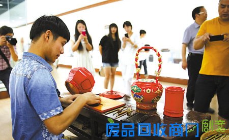 6月15日,宁海县数十位民间藏家在县文物办展厅组织非遗收藏展览活动,把珍藏的竹编和国家级非物质文化遗产———宁波泥金彩漆两大门类的近百件艺术作品展示给大众。图为民间手工艺人在展览现场进行竹编、泥金彩漆现场制作表演。