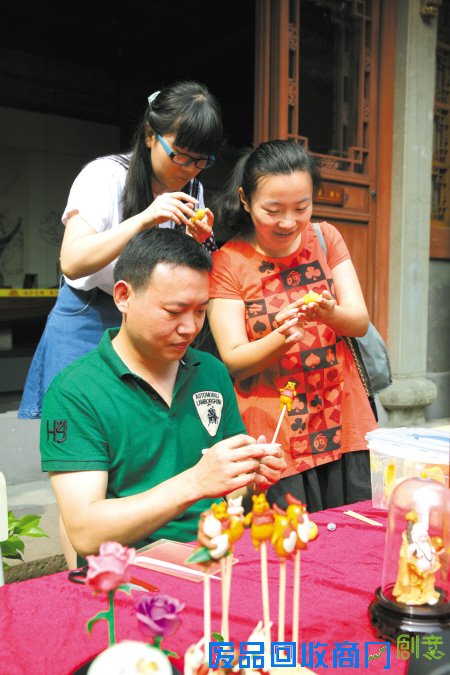 6月15日,在庆安会馆民间艺人展示非遗工艺品制作方法。