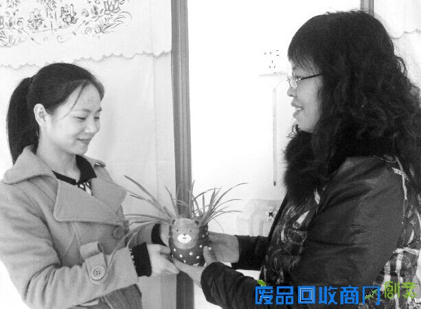 彭静帆(左)把自制的花盆送给亲戚