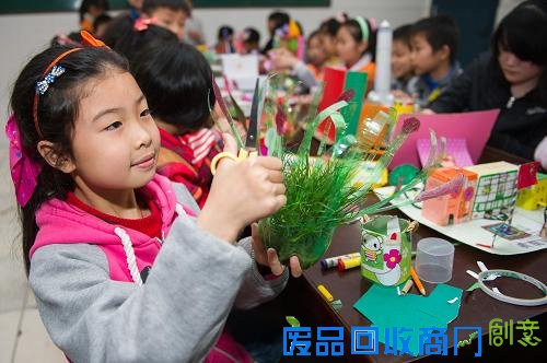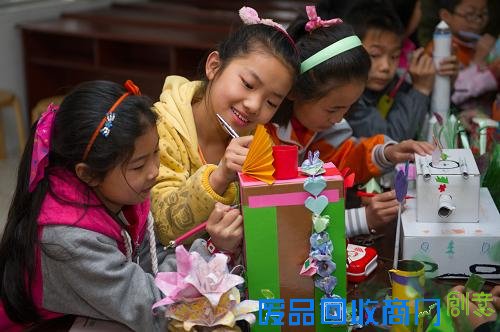 4月21日,合肥常胜小学的学生在用废旧物品制作手工作品。当日,合肥市铜陵路街道联合合肥农民工子弟学校常胜小学,开展“世界地球日”主题活动,旨在让孩子们了解地球、珍稀资源。孩子们在老师的指导下,用平时收集的旧报纸、饮料罐、塑料袋等各种废旧物品,制作出花瓶、文具盒、笔筒等实用的手工作品。(新华社记者 杜宇摄)