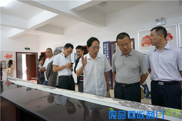 长沙市剪纸协会会长李民族向长沙市文明办副主任梁飞彩介绍自己的剪纸作品。