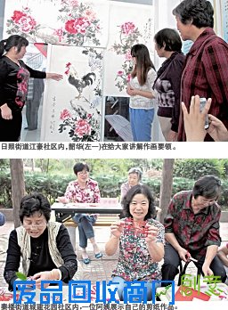 日照街道江豪社区的居民徐丽娟向正在作画的韶华老师乞求“墨宝”。社区书记迟艳艳表示,快到重阳节了,9月26日社区请了几位爱好书法、国画的老“艺术家”来“献宝”。没想到居民们的热情这么高,十几幅字画被一抢而光,有的书画还没完成就被“求”走。