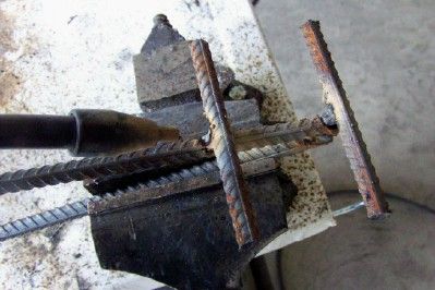 每对工具的摇篮开始与钢筋两块4 1/2英寸长的每个。 中心它们的基础上的三角形和焊接它们之间的杆件与一个2英寸的间隙。 尽可能地保持在两片水平和在同一平面上。