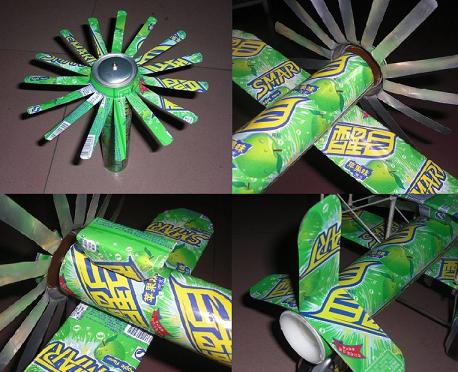 (五)用剪下来的废旧易拉罐瓶盖做飞机轮子