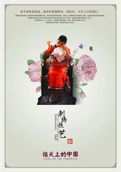 刺绣是针线在织物上绣制的各种装饰图案的总称。就是用针将丝线或其他纤维、纱线以一定图案和色彩在绣料上穿刺,以缝迹构成花纹的装饰织物。它是用针和线把人的设计和制作添加在任何存在的织物上的一种艺术。刺绣是中国民间传统手工艺之一,在中国至少有二三千年历史。中国刺绣主要有苏绣、湘绣、蜀绣和粤绣四大门类。