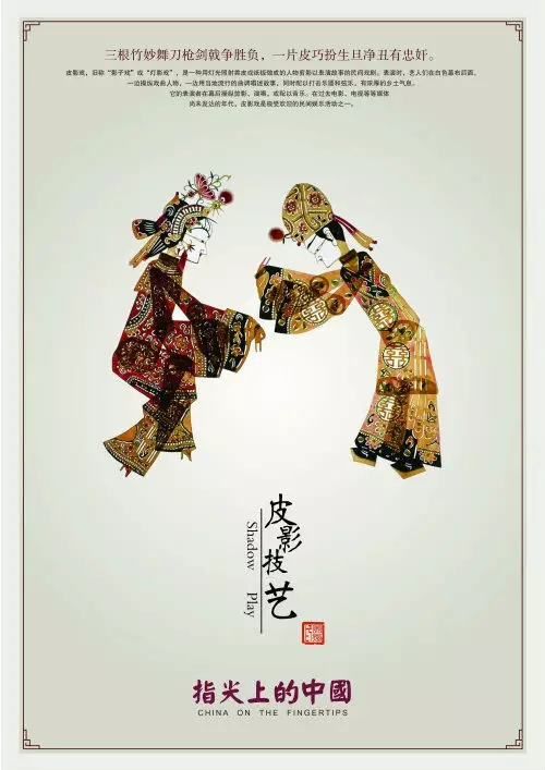 皮影戏,又称“影子戏”或“灯影戏”,是一种以兽皮或纸板做成的人物剪影,在灯光照射下用隔亮布进行演戏,是我国民间广为流传的傀儡戏之一。表演时,艺人们在白色幕布后面,一边操纵戏曲人物,一边用当地流行的曲调唱述故事,同时配以打击乐器和弦乐,有浓厚的乡土气息。皮影戏是中国民间的一门古老传统艺术,老北京人都叫它“驴皮影”。