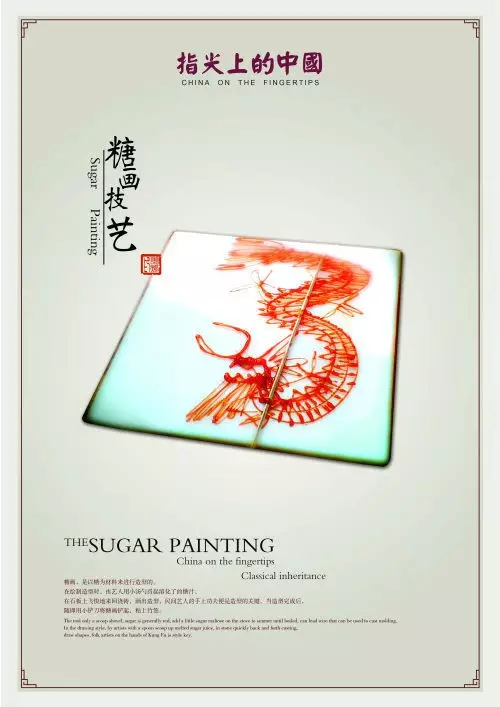 糖画,是以糖为材料来进行造型的。所用的工具仅一勺一铲,糖料一般是红、白糖加上少许饴糖放在炉子上用文火熬制,熬到可以牵丝时即可以用来浇铸造型了。在绘制造型时,由艺人用小汤勺舀起溶化了的糖汁,在石板上飞快地来回浇铸,画出造型,民间艺人的手上功夫便是造型的关键。当造型完成后,随即用小铲刀将糖画铲起,粘上竹签。