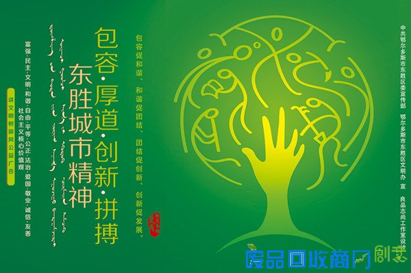 “东胜城市精神”主题作品的创意通过“一只张开的大手”象征一座城市的包容和大度,接纳一切有利于城市发展的事物;“人物图案”代表从事各项事业的人们和谐共处、创新拼搏。整体构图形似一棵蓬勃生长的大树,在绿色主基调映衬下象征着希望和梦想,意在表达东胜这座城市以海纳百川的宽广胸怀,广揽世界各地、四面八方的人才来干事创业,共建品质城市。