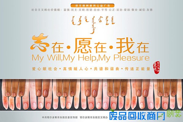 “志愿服务”主题作品的创意来自于钢琴合奏,黑白两色手指既代表钢琴琴键,又代表每个人举手之力的汇集,意在倡导全社会人人都奉献一份爱心,共谱鄂尔多斯和谐乐章。