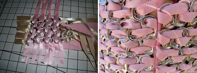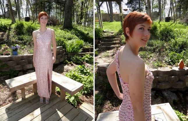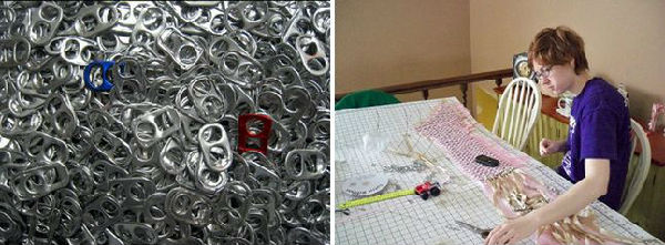 这位力行环保的外国女生在结婚前花了一百多小时,将平时收集的4000多个易拉罐拉环和彩带一针一线结合起来,编织出一件非常棒的晚礼服。这岂不正是快要失传的心灵手巧吗?快来欣赏欣赏佳作