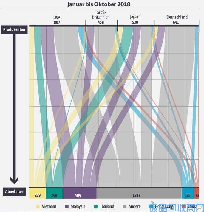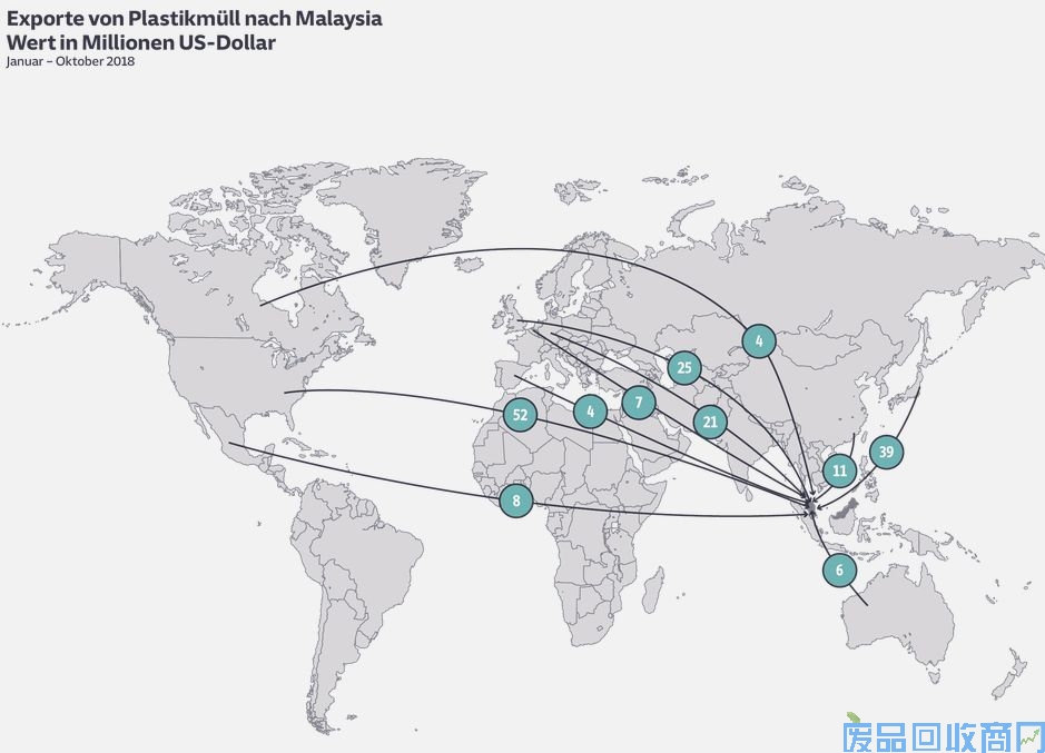 德国向来自诩为回收届的世界冠军。但每年回收到的数十万吨塑料垃圾却要出口国外。联合国数据显示,2018年一月到十月之前,垃圾进口大国马来西亚共计接收68.6万吨塑料。最大的来源国是美国,其次是日本,德国占第三。德国向马来西亚出口塑料废品总重量高达十万吨!