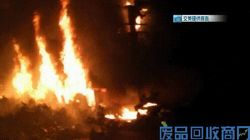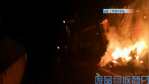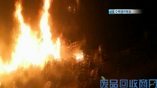 而油罐车的后方,一辆大货车正在起火燃烧,火势从轮胎蔓延到了车厢上方,现场火光冲天、一片狼藉。