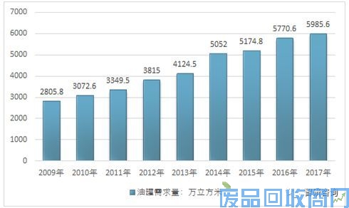 2017年我国油罐行业消费量5985.6万立方米,同比2016年的5770.6万立方米增长了3.73%。
