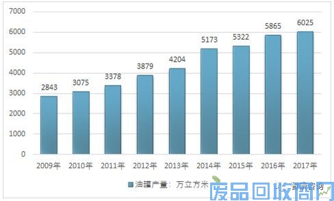2017年,我国油罐行业产量约6025万立方米,同比2016年的5865万立方米增长了2.73%。