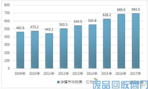 2017年我国油罐行业市场规模694.5亿元,同比2016年的689.9亿元仅增长0.67%,行业发展进入停滞。